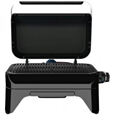 Portable black table grill with grill grate made of enamelled cast iron, 1200 cm² grilling surface, power: 2.4 kW, 1 Blue Flame burner for even heat distribution and juicy food, gas consumption: 175 g/h. Piezo ignition. Cartridge operation, integrated thermometer. Dimensions open: 59 x 47 x 61 cm, weight: 13 kg. Incl. hose and Easy-Click regulator for cartridge operation. Requires CV470 Plus cartridge (please order separately).